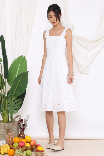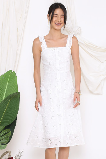 Featuring floral crochet laser-cut details allover, this versatile piece will take you through the summer! It also comes with a regular fit, has ruffles on the strap, and a concealed back zip closure.