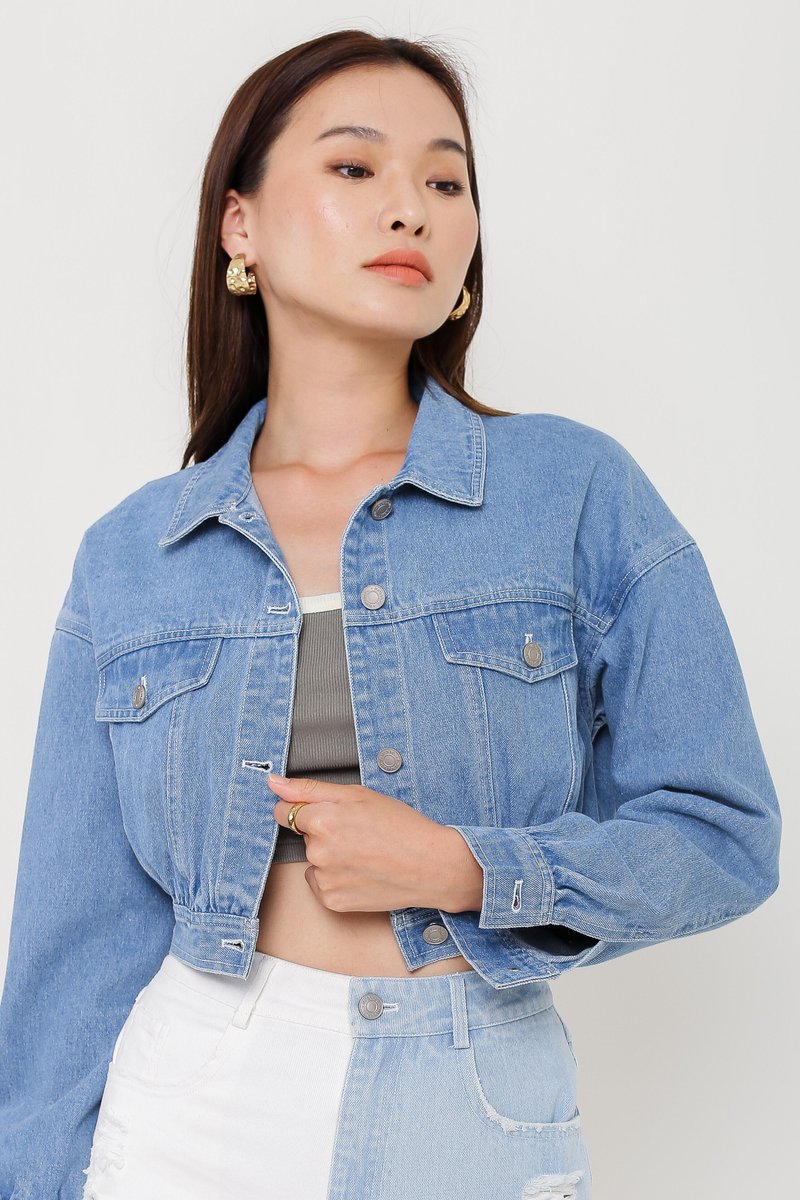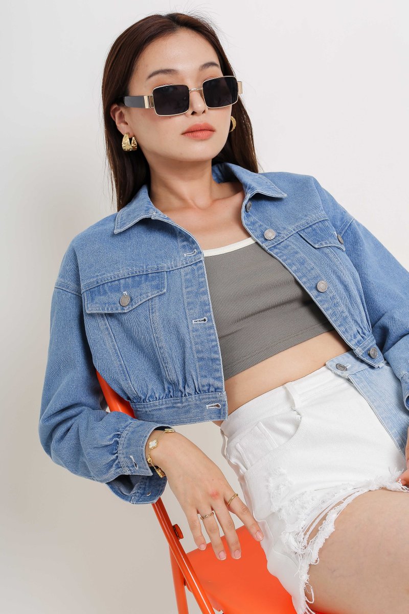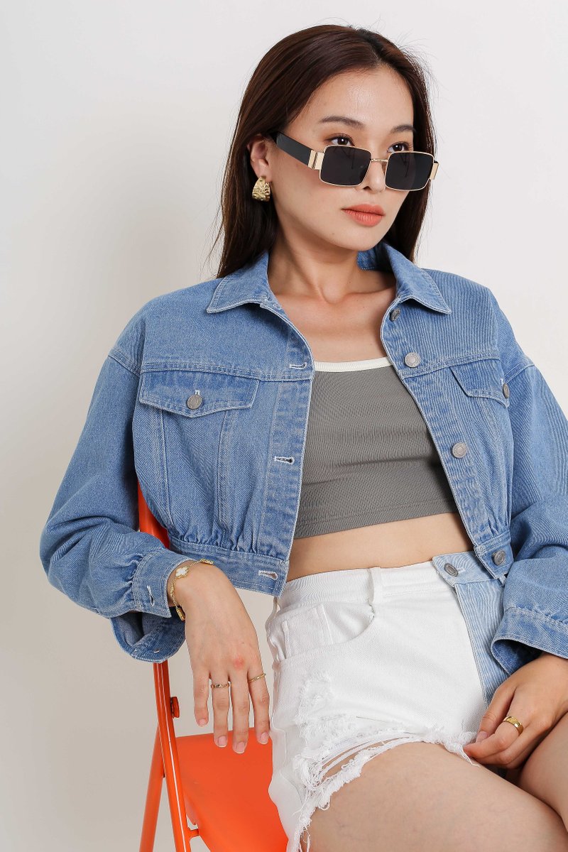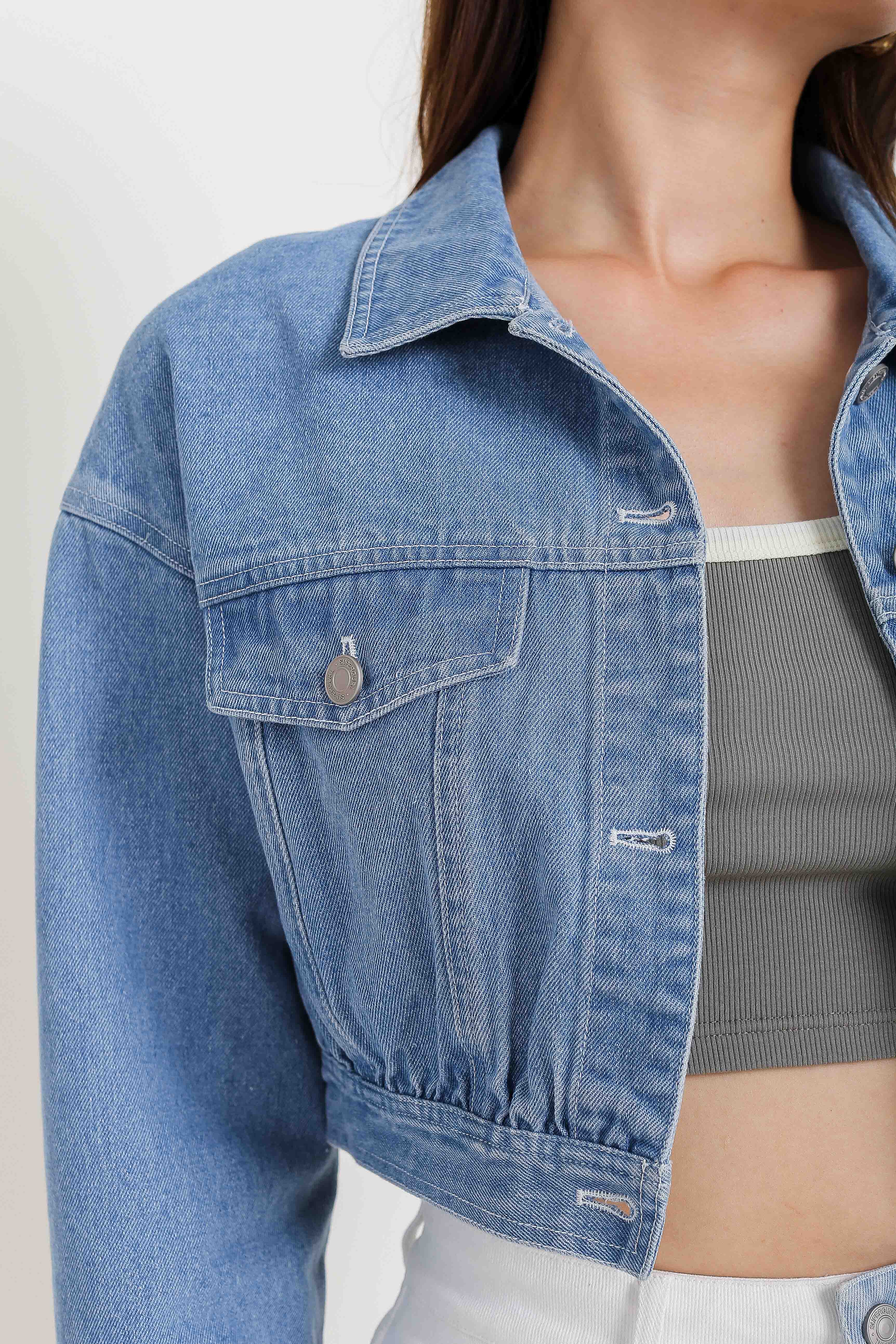 Our Coco Crop Denim Jacket is a must have outerwear for your casual day out! It features a cropped length boxy cut fit. All buttons are uniquely embossed with Supergurl's logo, button down closure and non-functional front pockets design!