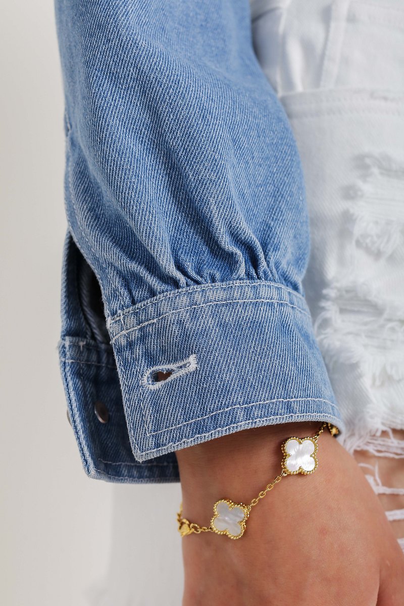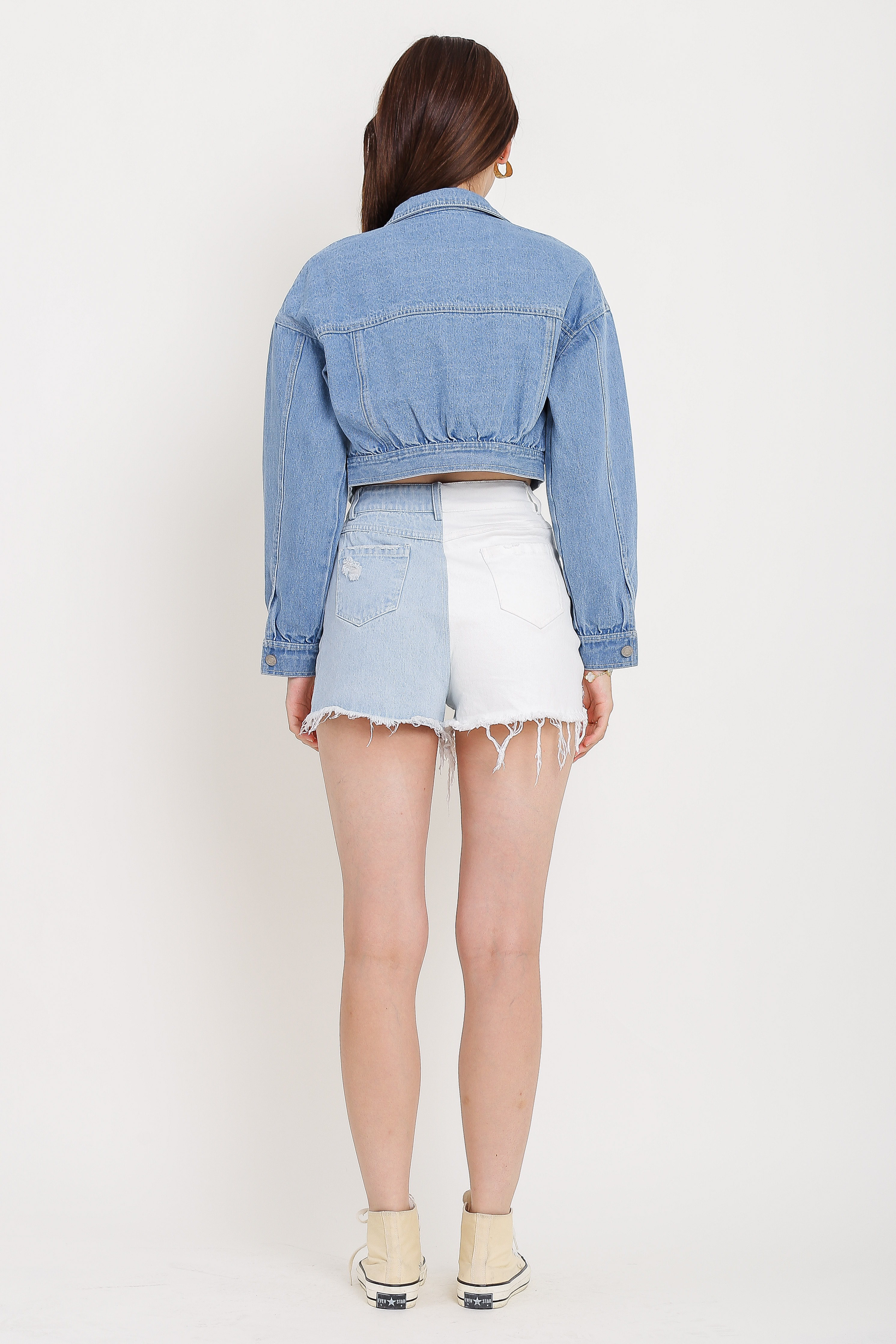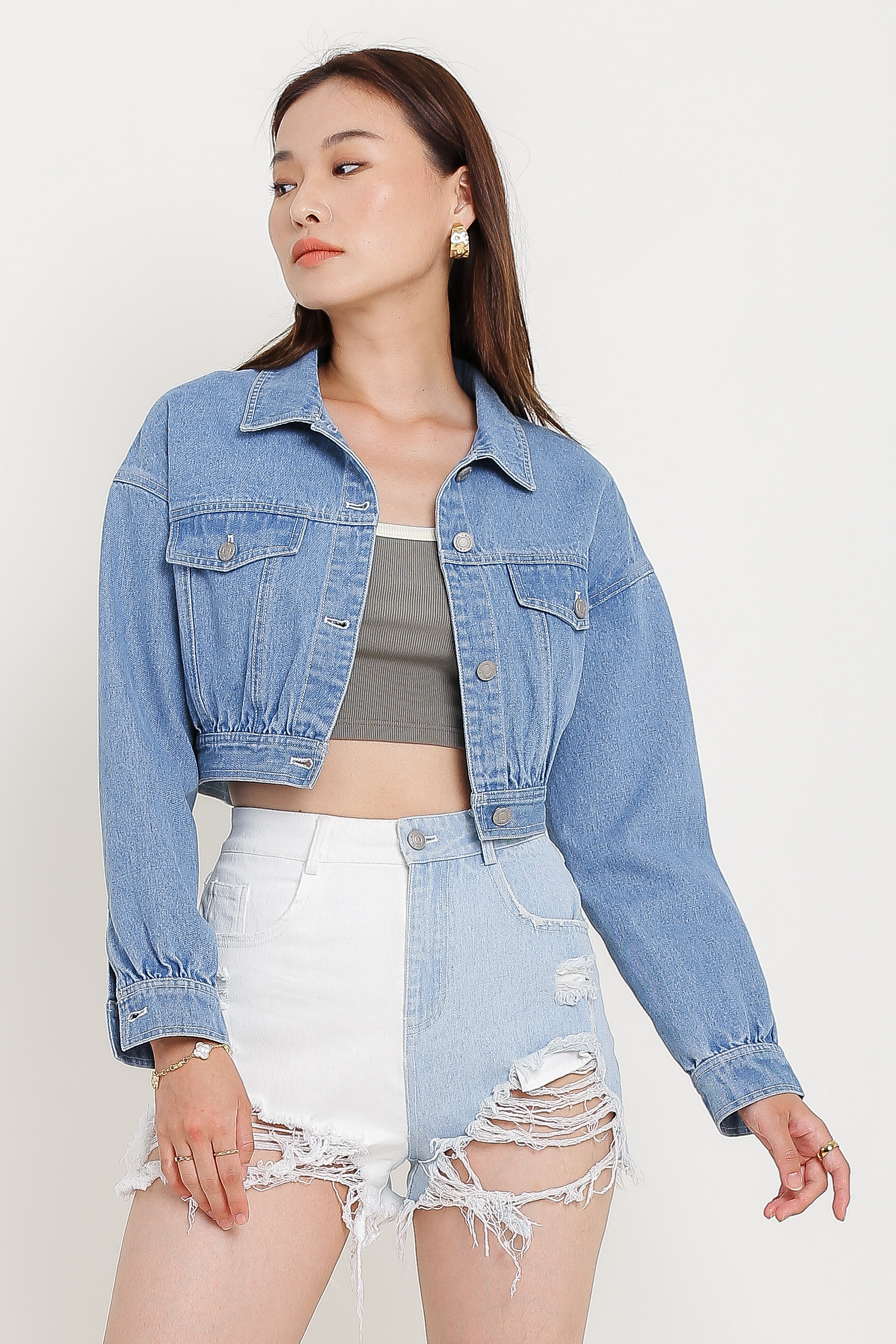 Our Coco Crop Denim Jacket is a must have outerwear for your casual day out! It features a cropped length boxy cut fit. All buttons are uniquely embossed with Supergurl's logo, button down closure and non-functional front pockets design!