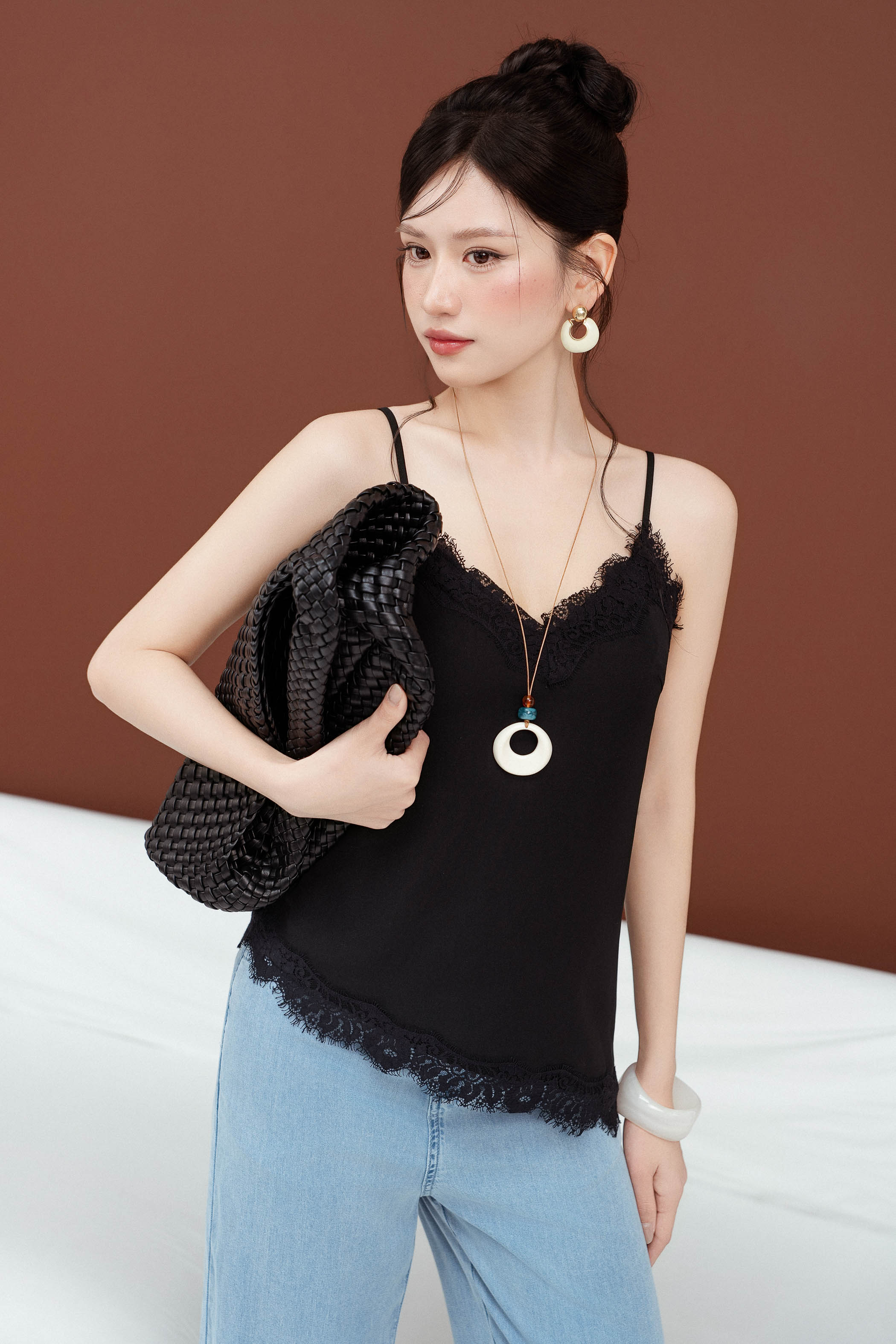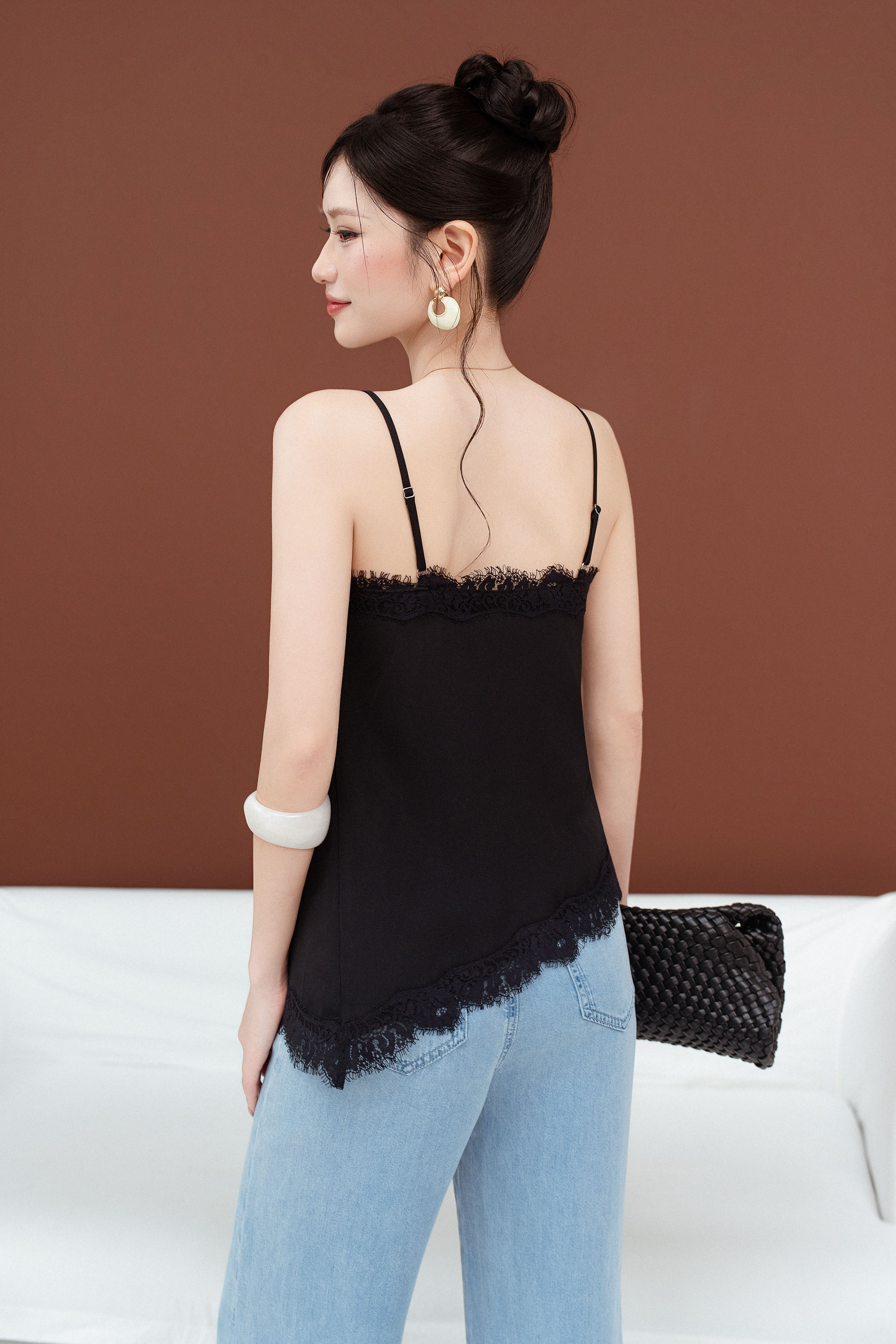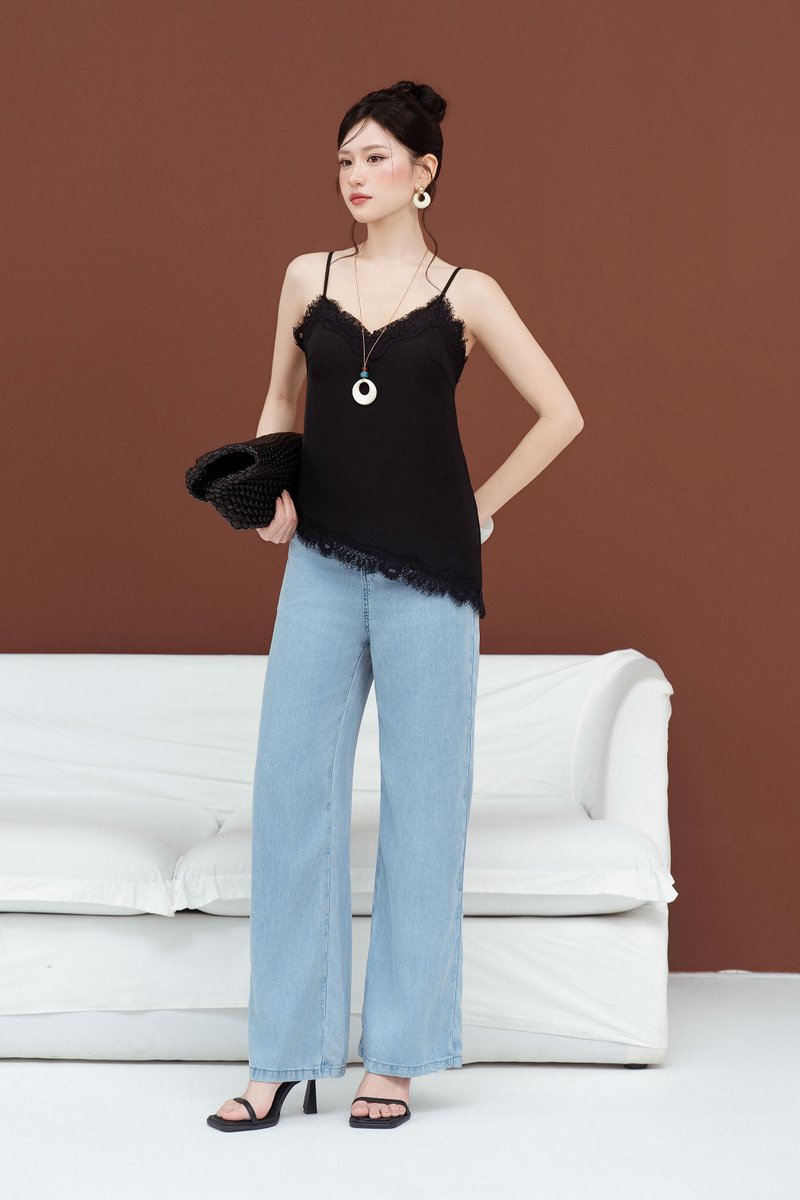- V-neckline with lace trimming