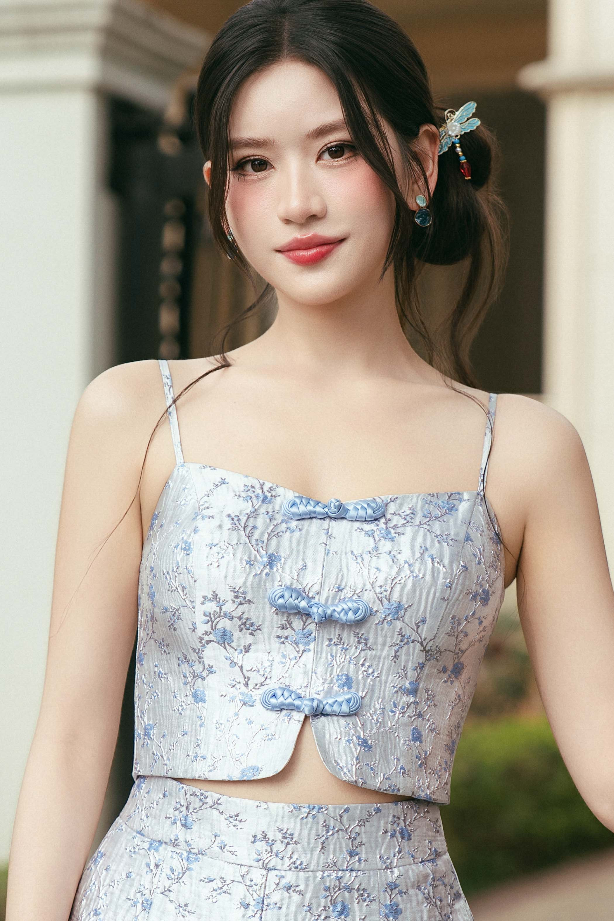 - Non-functional mandarin knots at the front